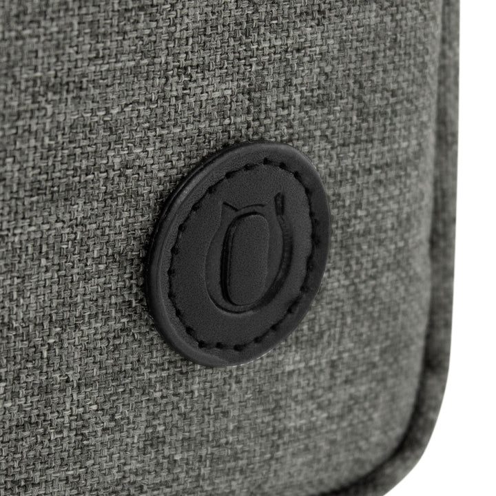 Fabricada en tela tipo lino, está disponible en dos tonos sobrios: gris con detalles marrón y gris con detalles negro, para que elijas el que mejor va contigo.
