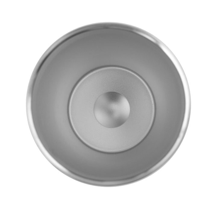 Cuenta con cuerpo de doble pared sellado al vacío, interior en acero inoxidable 304, exterior en acero 201 con pintura mate, y tapa plástica de boca ancha con anillo de silicona para un cierre seguro.